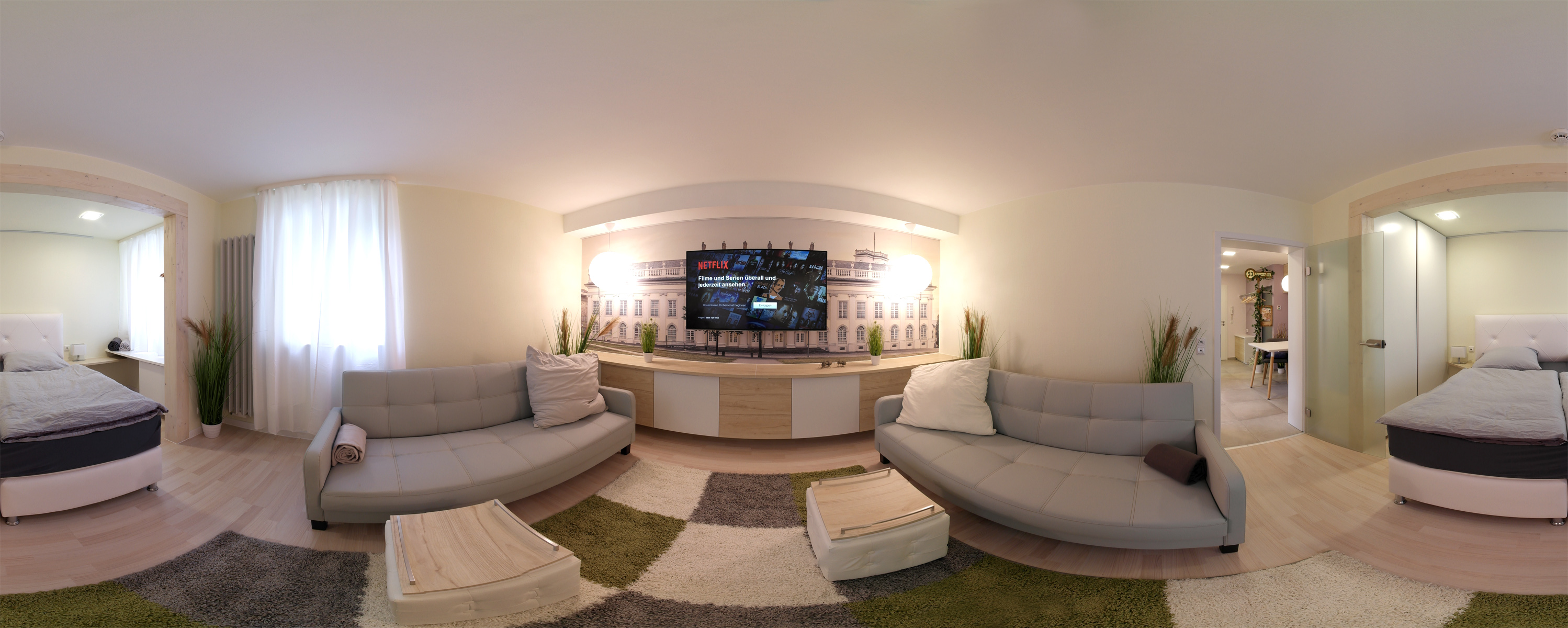 Schlafwohnzimmer mit einen Boxspringbett und zwei Liegesofas und Schränken.