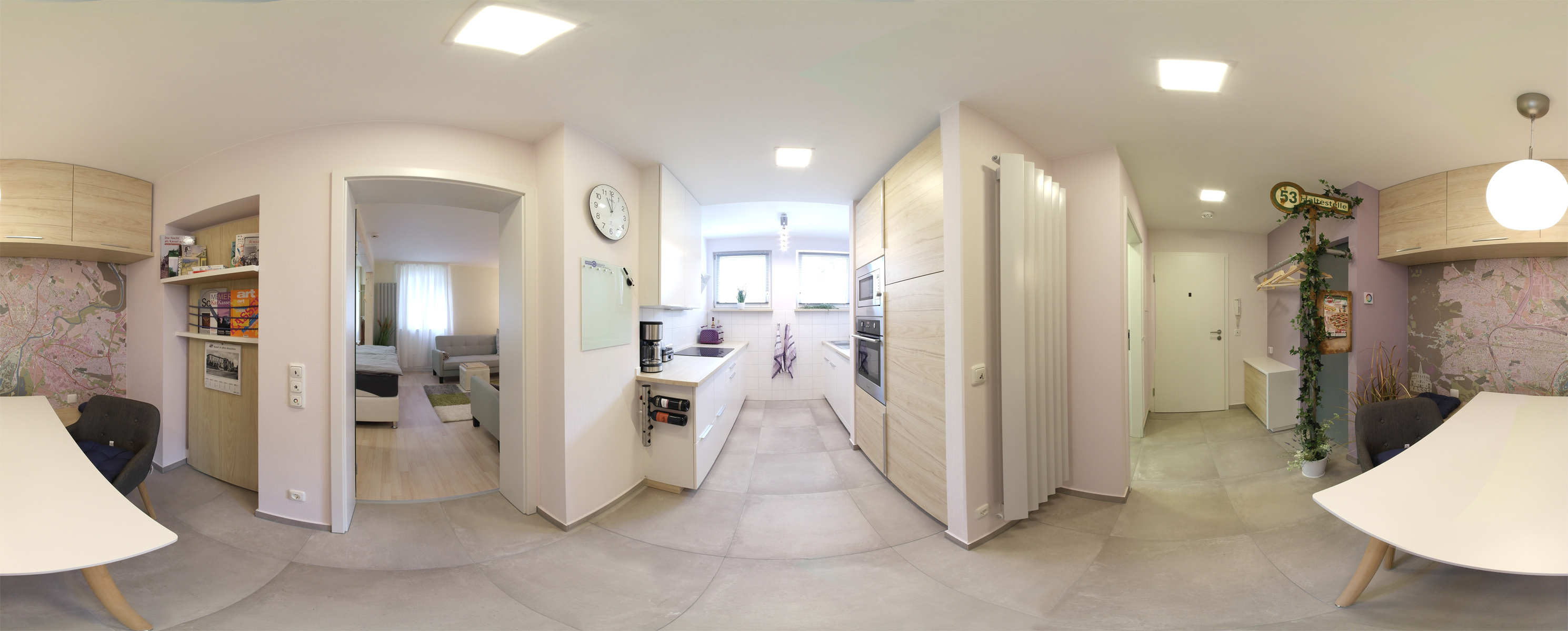 Besteck, Geschirr, Induktionskochfeld, Abzugshaube, Geschirrspüler, Spüle, Backofen, Kühlschrank mit Eisfach, Mikrowelle inkl. Grill, Kaffevollautomat, Filterkaffemaschine, Wasserkocher, Eierkocher. Eine Grundausstattung an Gewürzen steht ihnen zur Verfügung.
